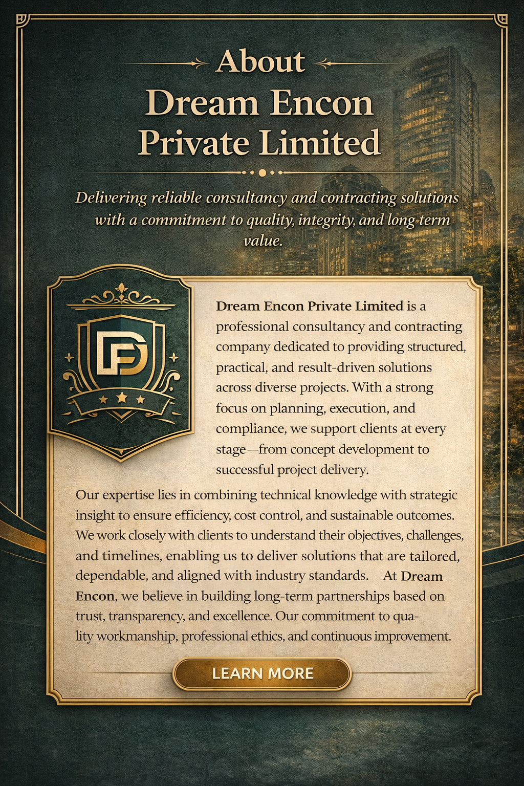 Dream Encon Private Limited is an ISO 9001:2015–driven engineering and contracting organization delivering reliable, safe, and high-quality mechanical and project execution solutions across India. With strong expertise in engineering, fabrication, erection, pipeline projects, operations & maintenance, and technical manpower deployment, we support complex industrial and infrastructure requirements with precision and professionalism.